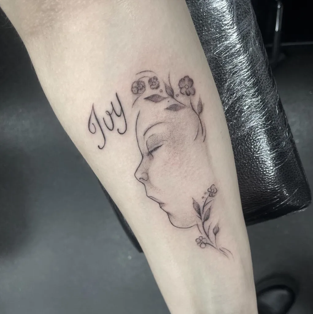 This elegant tattoo showcases a continuous line forming the delicate profile of a baby’s face, topped with a small heart to symbolize love. The line seamlessly transitions into the name “Briella,” written in graceful script along the forearm.