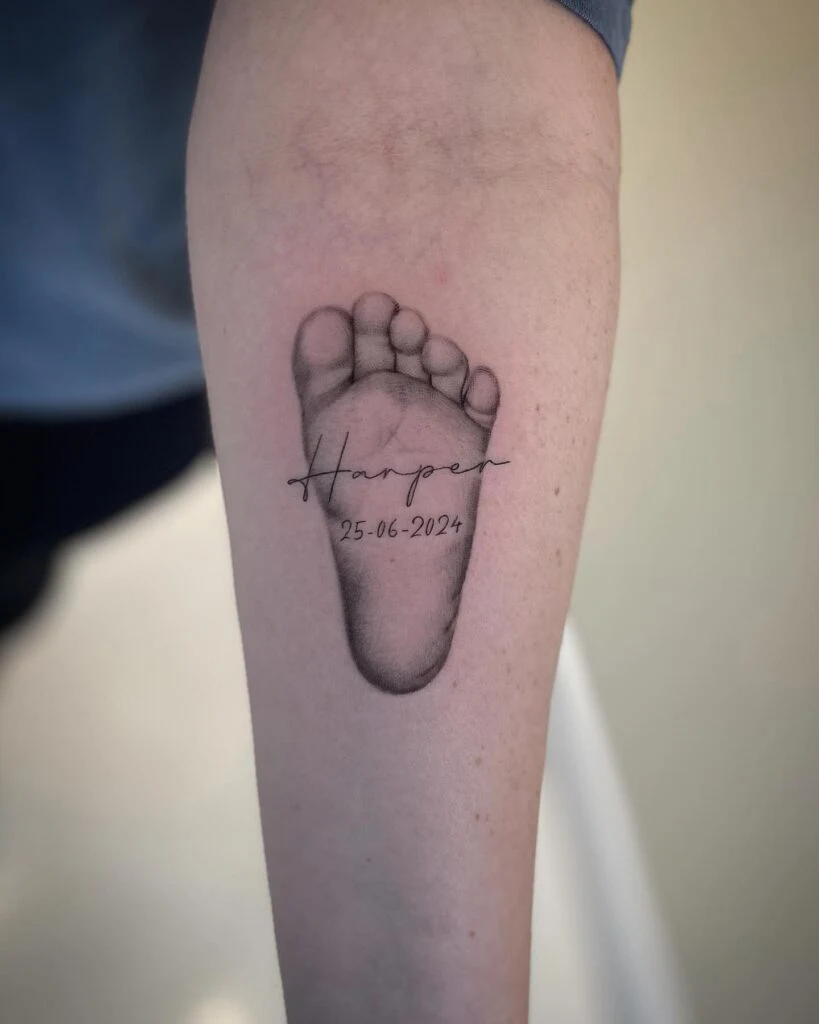This tattoo captures the tender memory of a baby’s arrival with a lifelike footprint pressed onto the skin. The print’s natural smudges and gentle texture give it an authentic, heartwarming feel.