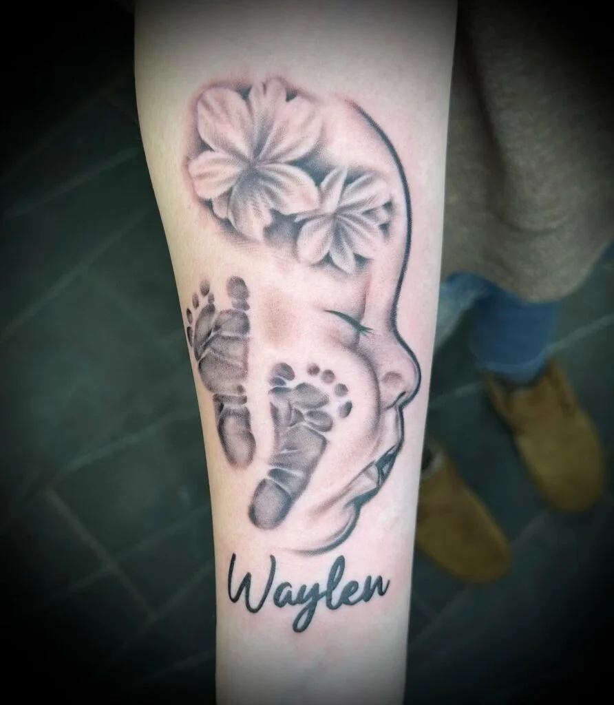 Floral Baby Silhouette Tattoo with Footprints and Name