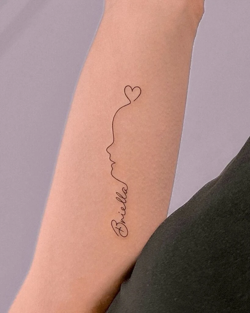 This elegant tattoo showcases a continuous line forming the delicate profile of a baby’s face, topped with a small heart to symbolize love. The line seamlessly transitions into the name “Briella,” written in graceful script along the forearm.