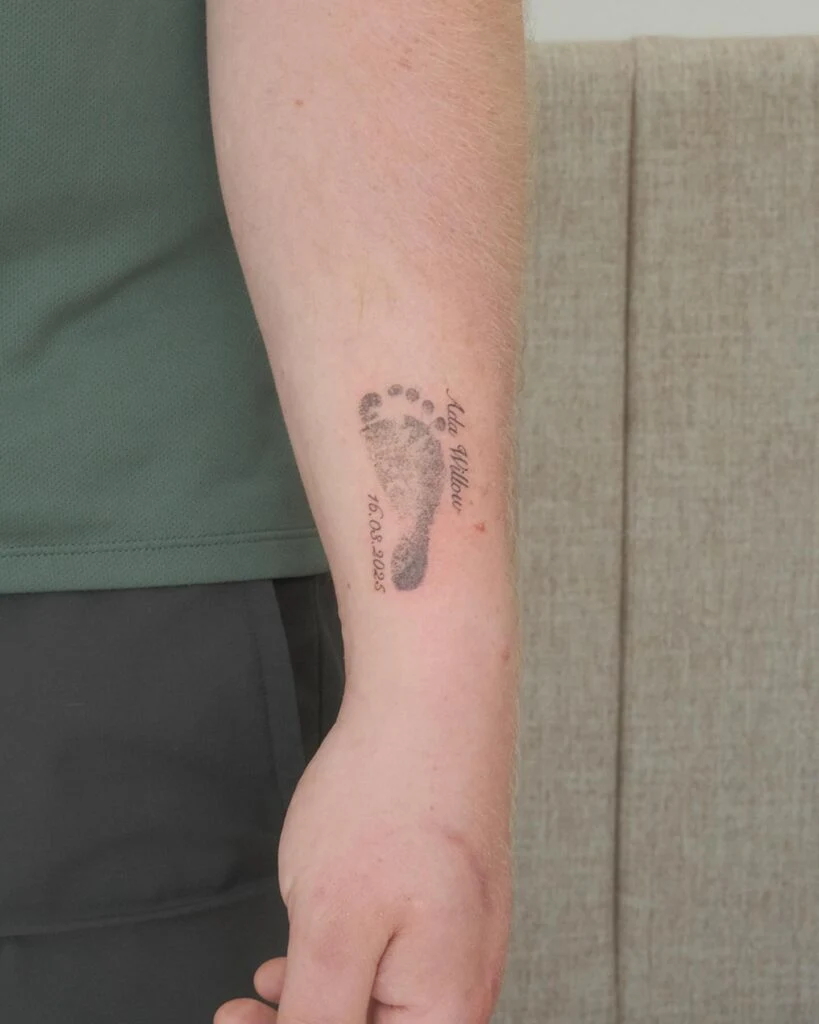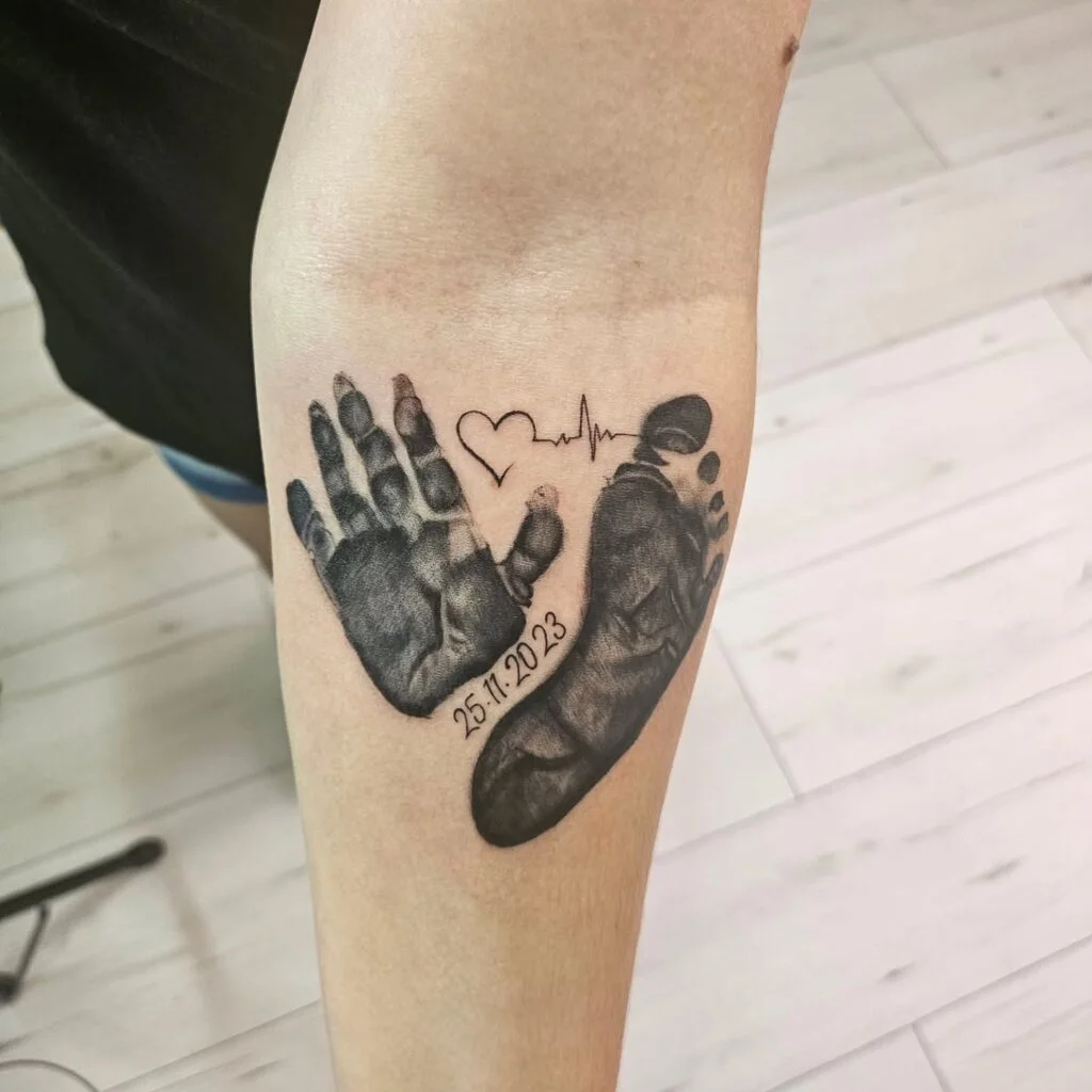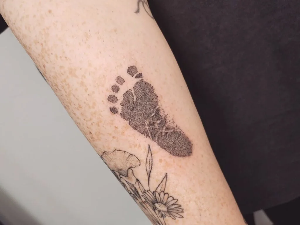 This tattoo captures the tender memory of a baby’s arrival with a lifelike footprint pressed onto the skin. The print’s natural smudges and gentle texture give it an authentic, heartwarming feel.