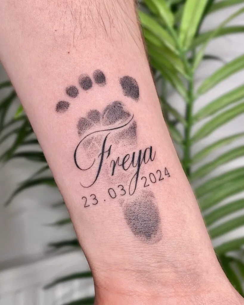 This tattoo features a small, detailed baby footprint placed vertically along the forearm. It captures the unique lines and textures of a real footprint, making it feel intimate and authentic. Beside it, the name and birthdate are delicately written in a fine, cursive script, adding a gentle, personal touch.