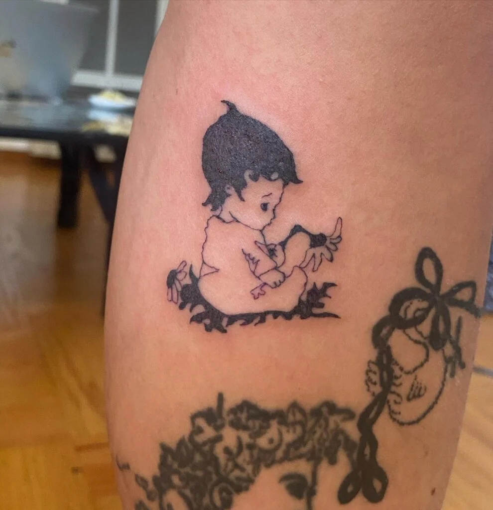 This delicate tattoo captures the peaceful profile of a sleeping baby, beautifully shaded to create softness and serenity. Surrounding the baby’s head and neck are small flowers and leafy vines, adding a gentle, nature-inspired touch.