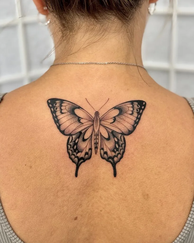 This beautifully placed upper back tattoo showcases a detailed butterfly with softly shaded wings and bold black tips. The gradient from soft pinkish tones to dark borders creates a sense of movement and grace.