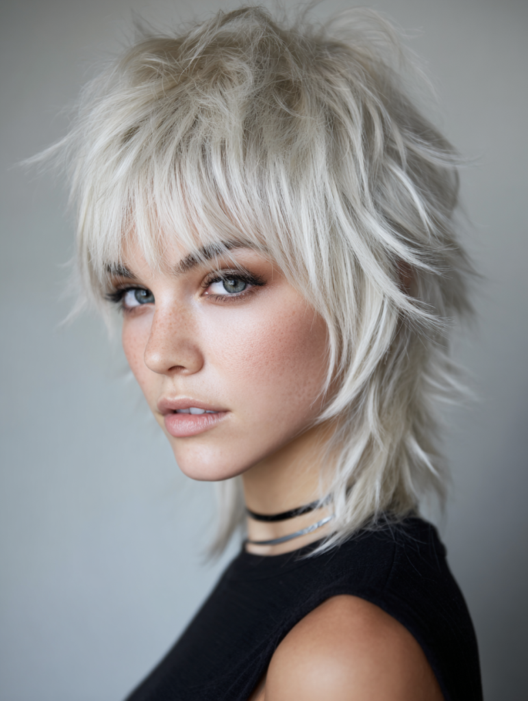 A platinum blonde wolf cut makes the layered silhouette sharp and dramatic. The cool tone highlights crown lift and textured ends. The overall look feels bold and high contrast.