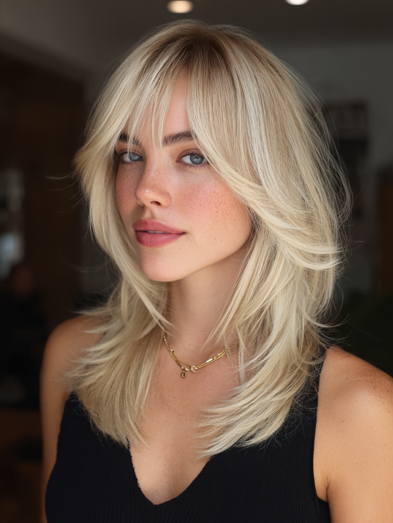 When styled with loose bends or waves, the layered structure becomes even more noticeable. The champagne tone brightens the look overall, giving the haircut a refined finish that still feels playful and modern.