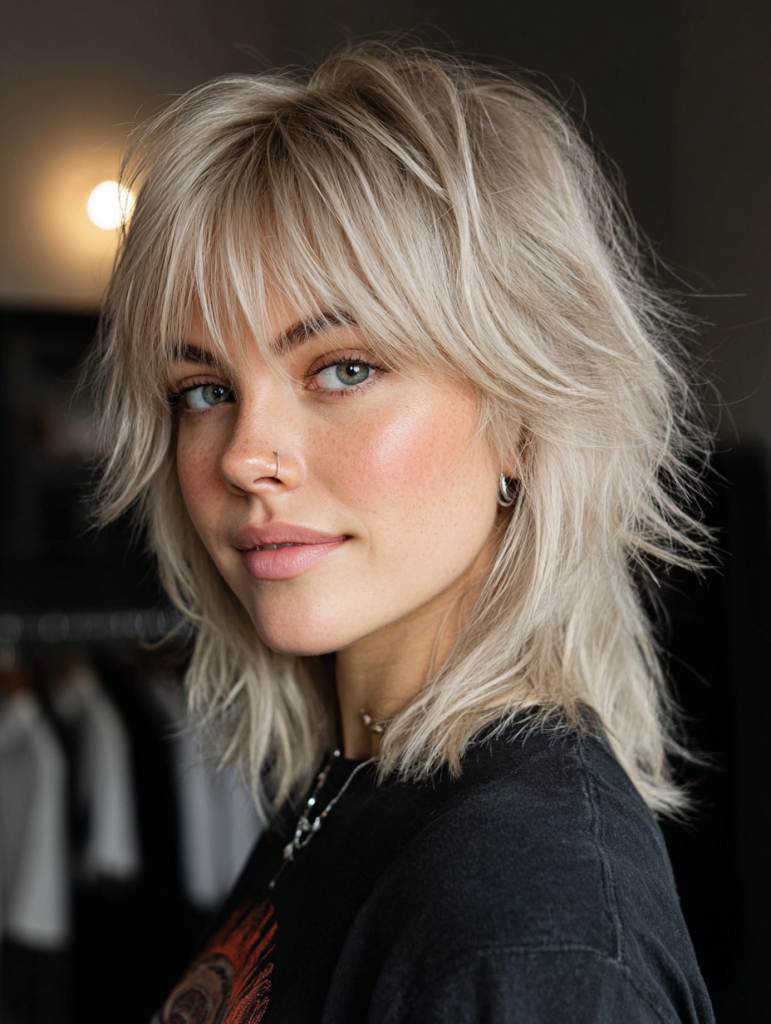 Icy blonde coloring intensifies the sharp structure of a choppy wolf cut, producing a striking yet wearable hairstyle. The cooler tone contrasts with darker roots, helping layers appear more defined. Short, jagged pieces around the crown create dramatic lift, while longer strands keep the look balanced.