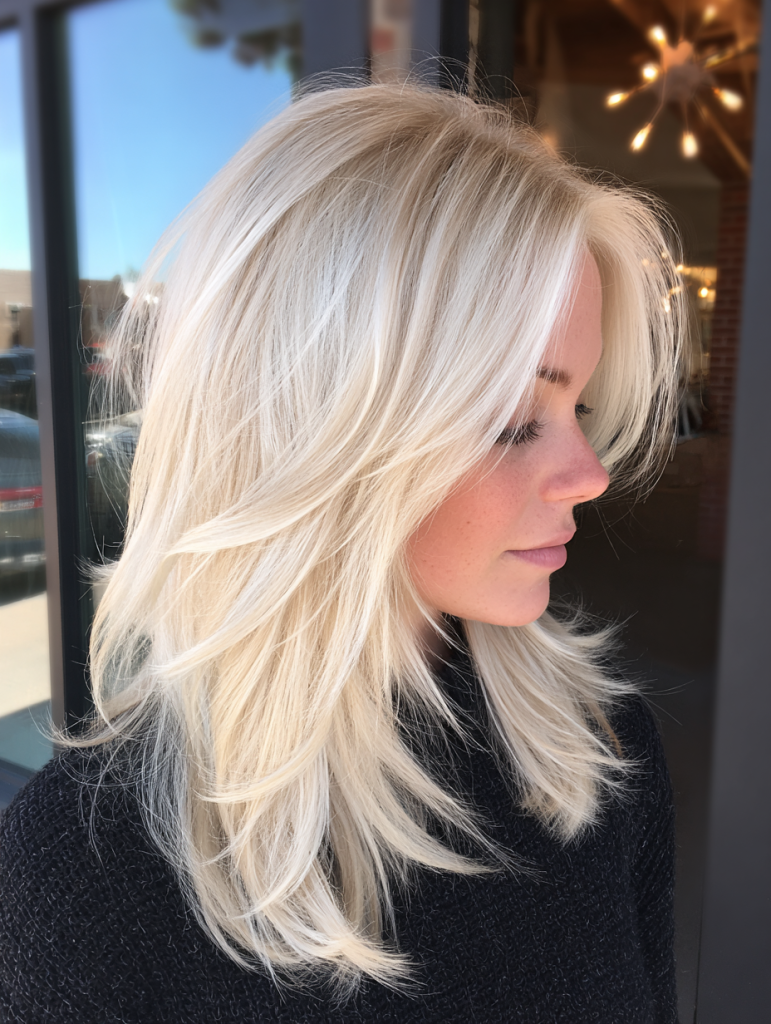 Styling with a round brush can lift the top layers while leaving the ends slightly tousled. The soft vanilla tone reflects light subtly, helping each layer stand out while keeping the overall style polished, airy, and easy to maintain.