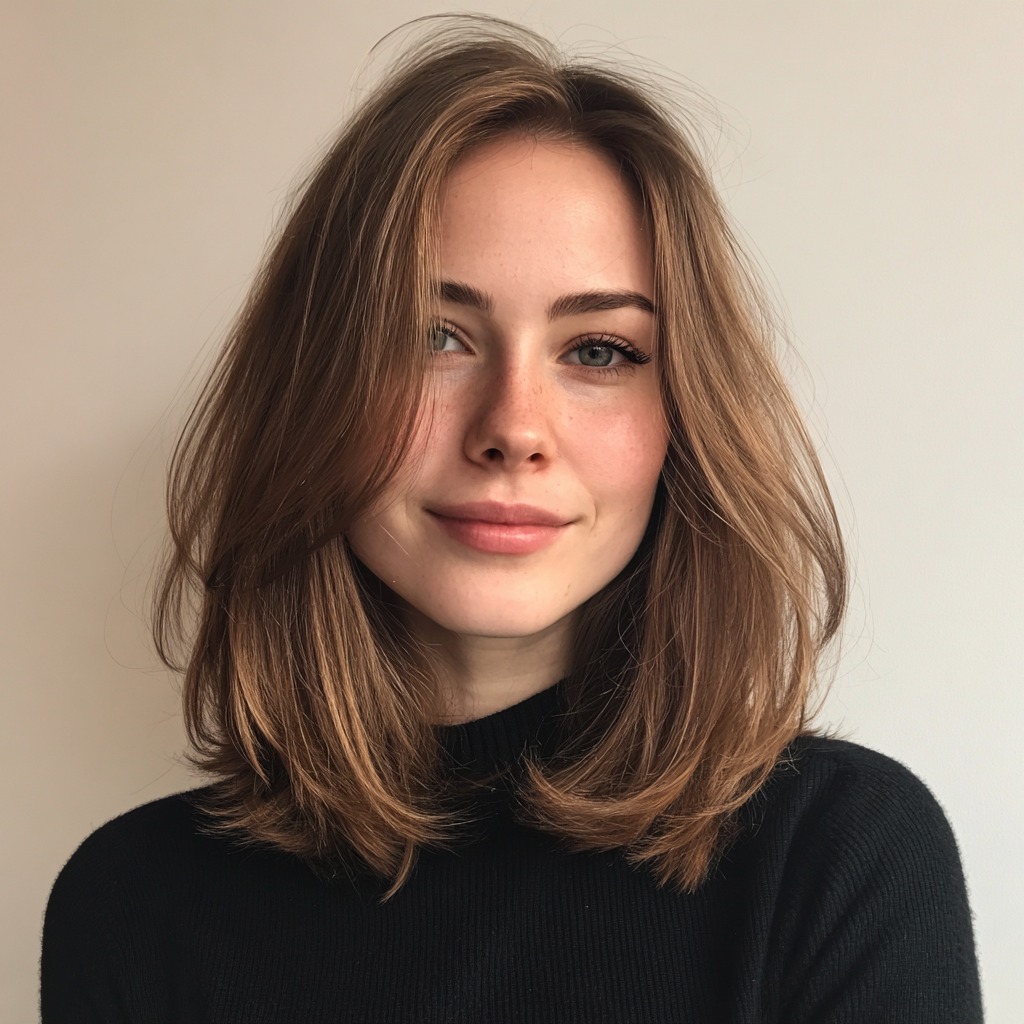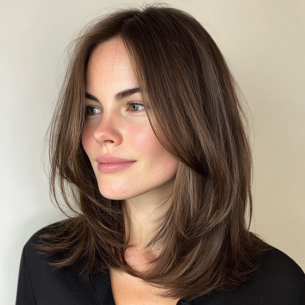 The length keeps fullness away from the cheeks, which helps balance facial width. Layers add movement, so the hair does not hug the face. A middle or slightly off center part works best here. This style fits office settings, casual days, and low effort mornings. Maintenance stays manageable with trims every six to eight weeks.