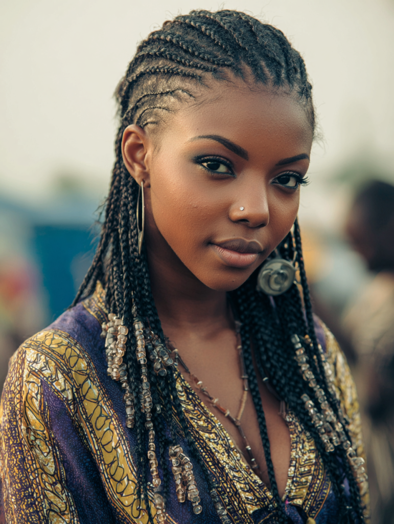 Inspired by traditional African braiding techniques, Fulani braids combine cornrows with loose braids and decorative elements. This style often features a central braid, side patterns, and beads or cuffs for added personality. It’s a standout look that blends cultural heritage with modern styling.