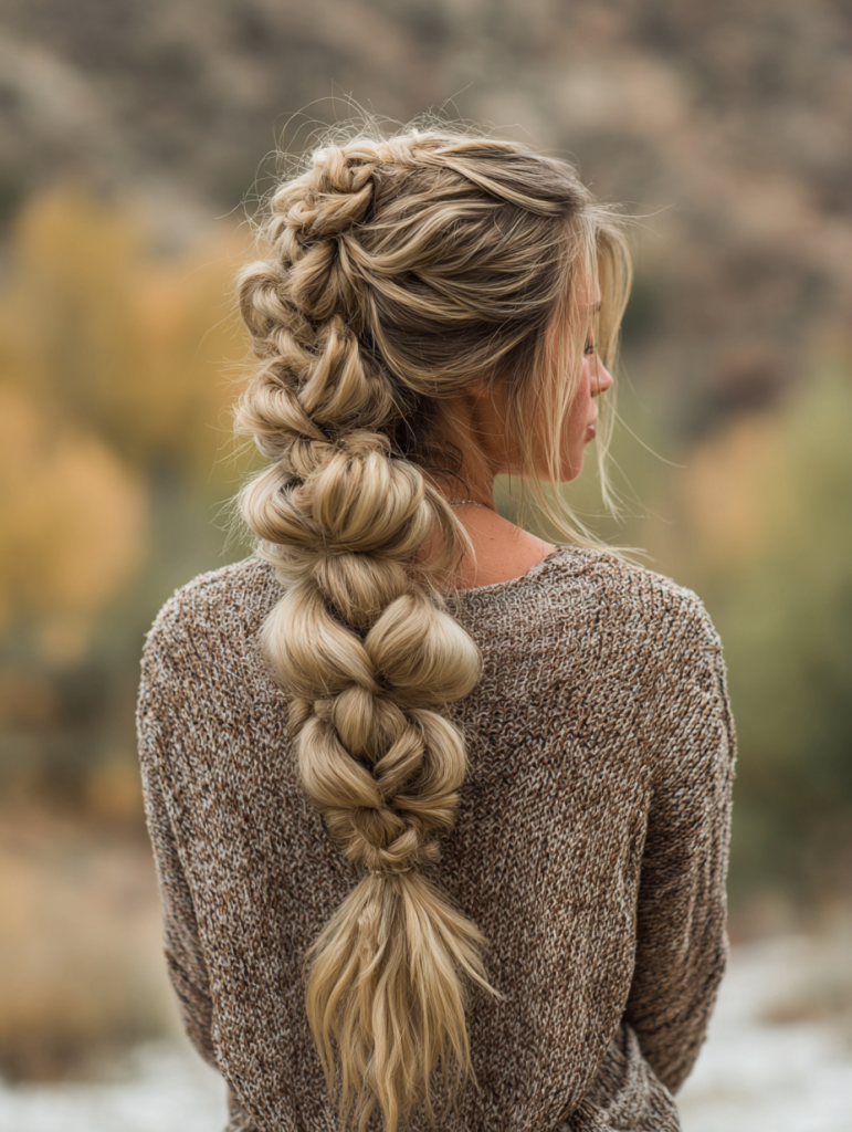 A pull-through braid mimics the appearance of a full, voluminous braid without requiring traditional braiding techniques. Created using small ponytails, it forms a bold, bubble-like structure that stands out easily. This style is perfect for those who want a dramatic look with minimal complexity.