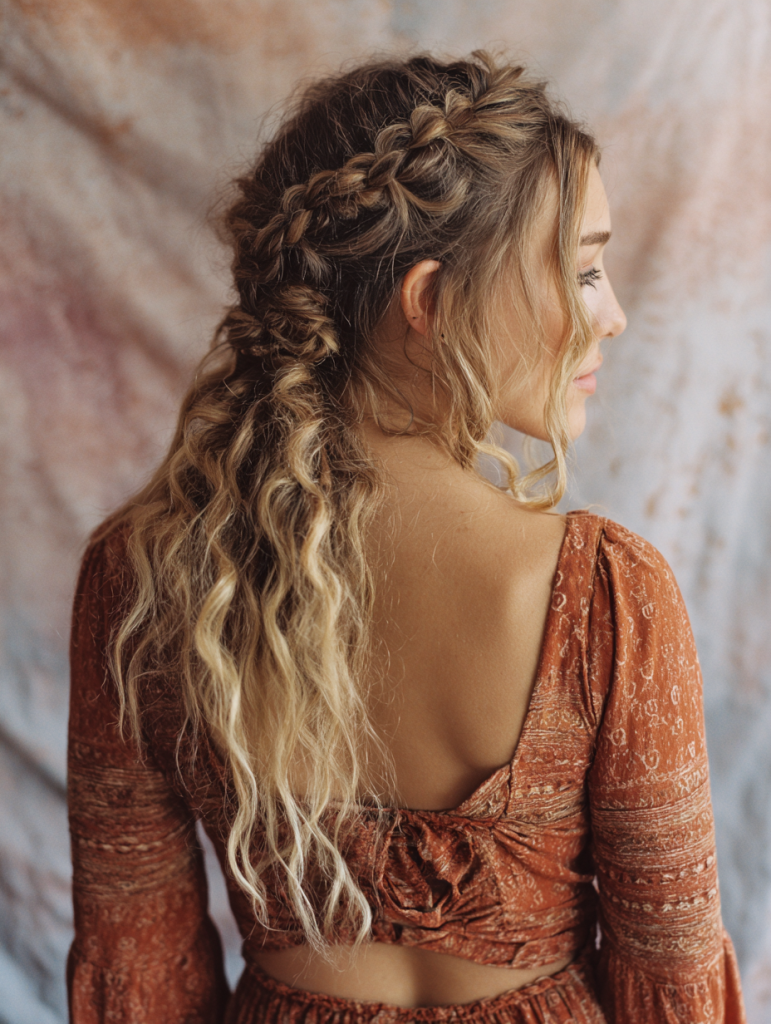 This hairstyle works beautifully on wavy or straight hair, enhancing natural movement and dimension. It’s perfect for dates, weddings, or casual days when you want something delicate. Pairing it with loose curls adds even more texture, making the overall look feel airy and polished.