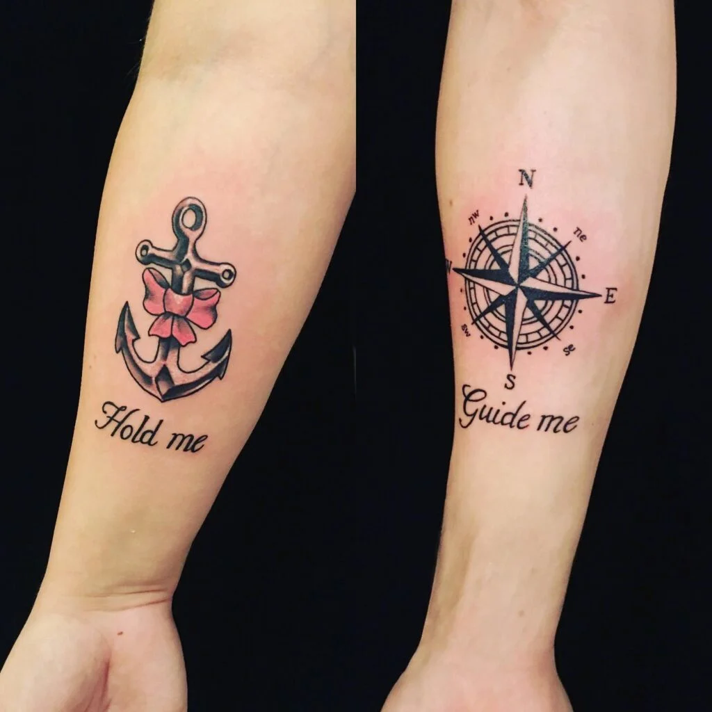These meaningful tattoos pair an anchor with a pink bow reading “Hold me,” and a compass rose with the words “Guide me.” Together, they beautifully symbolize the balance siblings bring to each other’s lives—one offering steady grounding, the other providing direction.