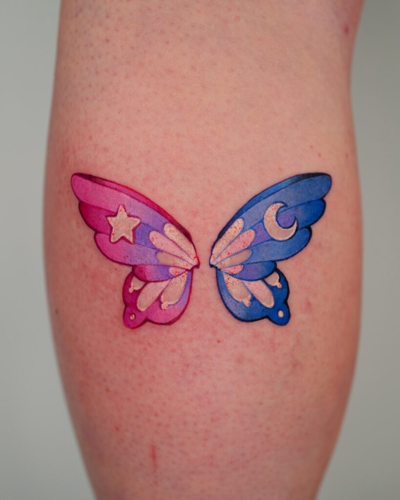 This playful and colorful tattoo showcases a stylized butterfly formed by two vibrant wings—one pink with a star and the other blue with a crescent moon. The soft pastel shading and cartoon-like shapes give the design a whimsical, uplifting vibe. Representing balance and duality, it symbolizes the harmony between light and dark, day and night, or even different sides of one’s personality.