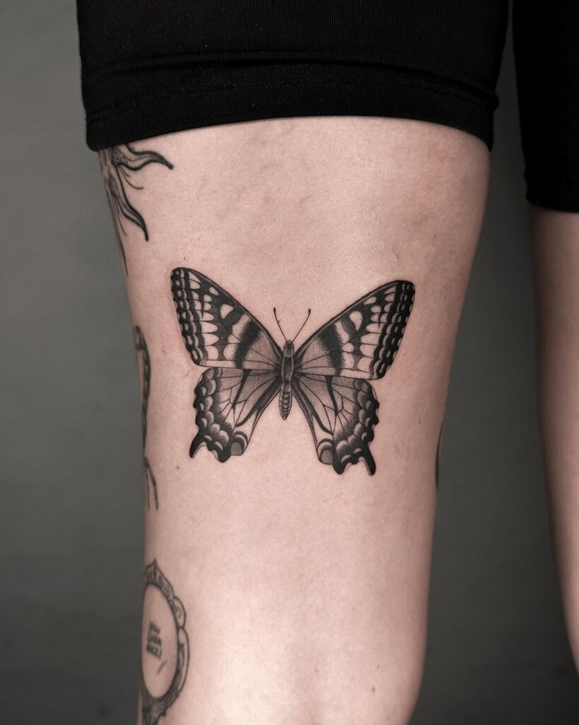 This finely detailed black and grey butterfly tattoo showcases lifelike symmetry and shading that brings the wings to life. Positioned on the thigh, the design features smooth gradients and precise linework that mimic natural patterns found in real butterfly species.