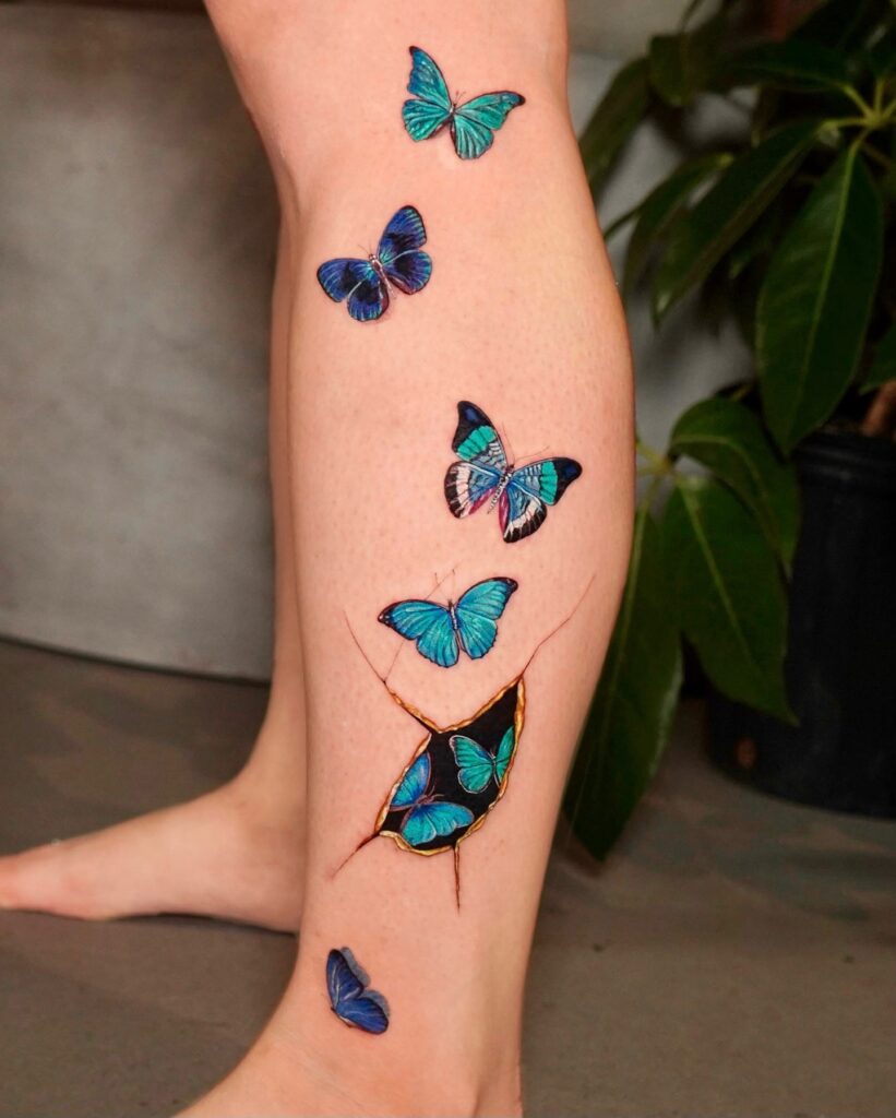 This eye-catching leg tattoo features vibrant blue butterflies appearing to fly out from a 3D torn skin effect. The illusion of butterflies escaping from beneath the surface gives the design a powerful sense of freedom and transformation.