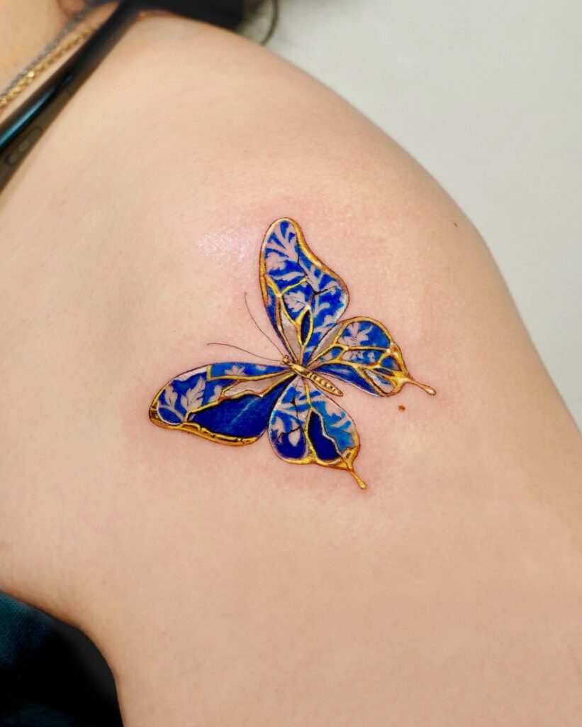 Porcelain Blue Butterfly Tattoo with Gold Detailing