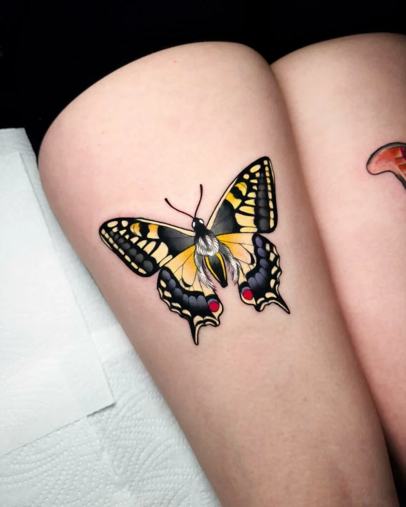 This vibrant tattoo features a beautifully detailed swallowtail butterfly with bold yellow and black wings, accented by vivid red spots and creamy white highlights. The realistic texture and high contrast create a lifelike appearance, making the butterfly seem as if it’s ready to lift off the skin.