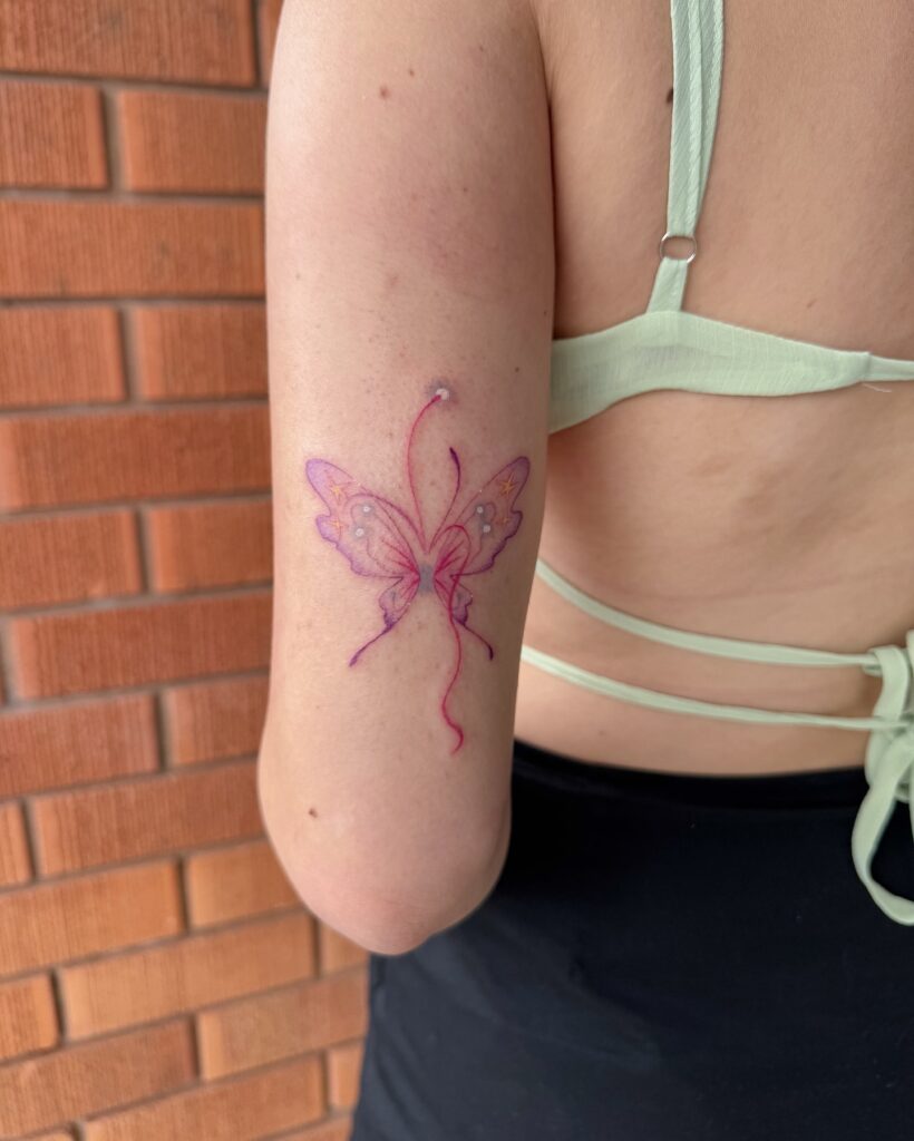 This charming butterfly tattoo glows with playful energy through its soft pink and purple hues. Placed on the upper arm, the butterfly features flowing wing shapes and delicate antennae, enhanced by tiny star and dot accents for a magical touch.