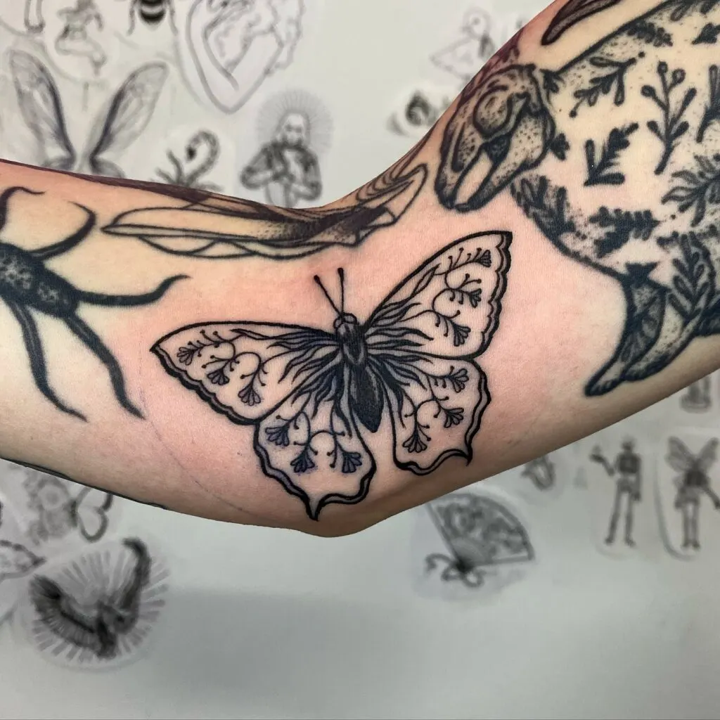 This elegant blackwork butterfly tattoo features delicate botanical motifs integrated into its wings. The floral-inspired details add a soft, ornamental touch while keeping the design minimal and clean. With smooth linework and symmetrical balance, it evokes a natural harmony between beauty and transformation.