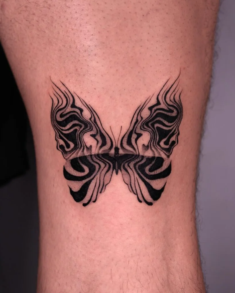 This butterfly tattoo takes a psychedelic twist with its bold, abstract design. The wings are filled with swirling black lines that mimic the look of a hypnotic optical illusion. The contrast between thick and thin curves adds a sense of movement, almost as if the butterfly is pulsing or shifting form.