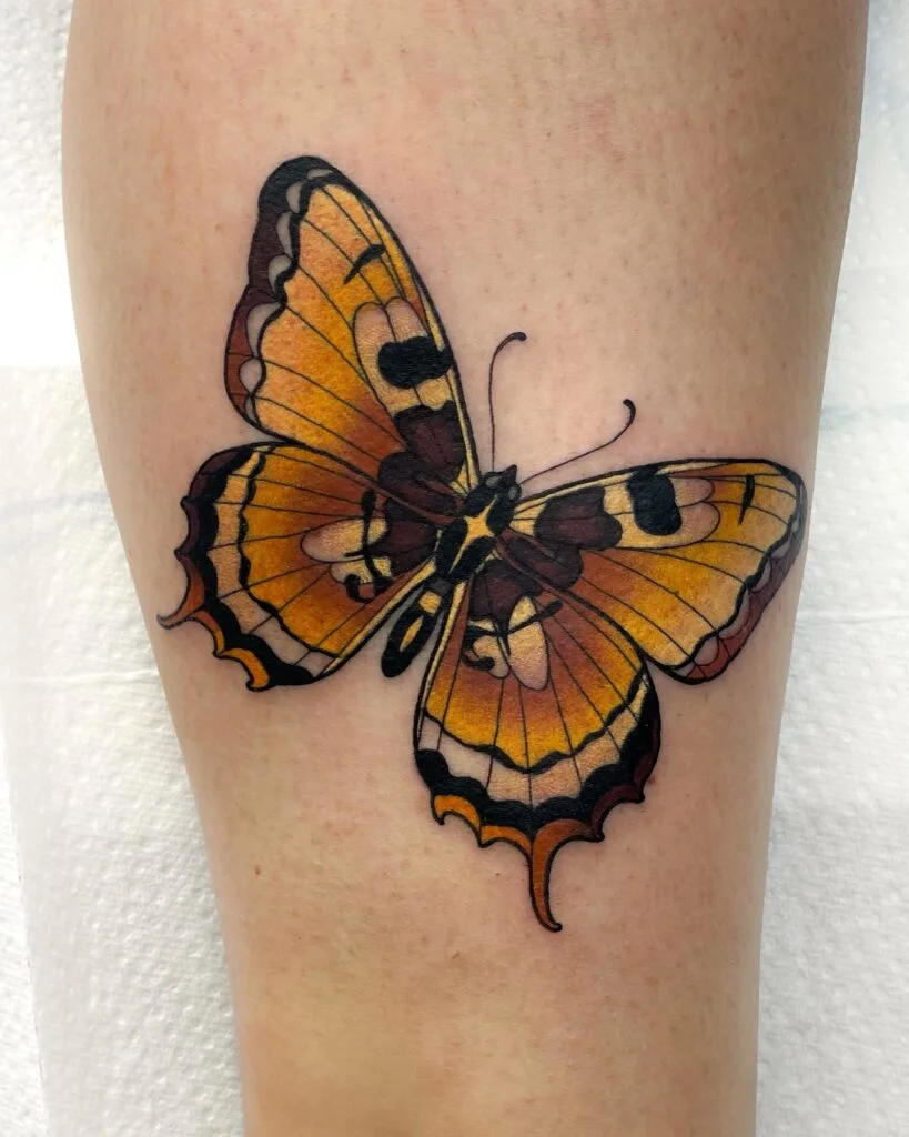 This tattoo celebrates natural beauty and freedom, capturing the essence of a butterfly in motion. It’s a timeless and elegant choice for anyone who values growth, change, and the vibrant joy found in life’s simplest moments.