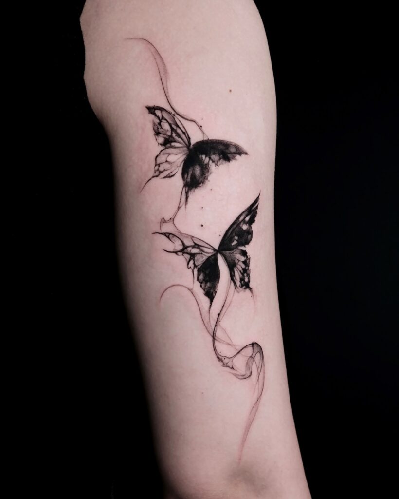This graceful tattoo features two black butterflies suspended in motion, connected by soft, smoke-like trails. The design blends realistic detailing with a dreamy, abstract flow, giving the butterflies a weightless, drifting appearance. Their wings are partially faded, adding a sense of fragility and movement, as if they’re dissolving into the air.