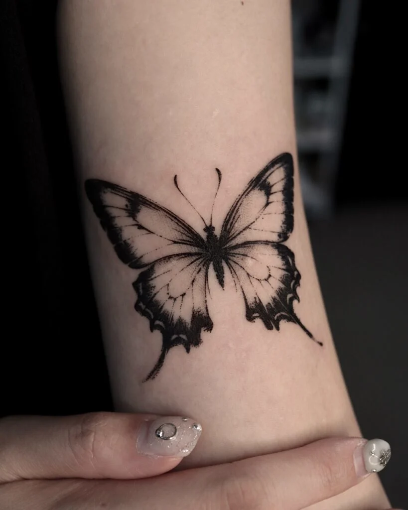 This stunning black and grey butterfly tattoo stands out with its refined gradient shading and graceful wing tips. The design fades beautifully from deep black edges into a lighter center, creating a soft, almost ethereal effect.