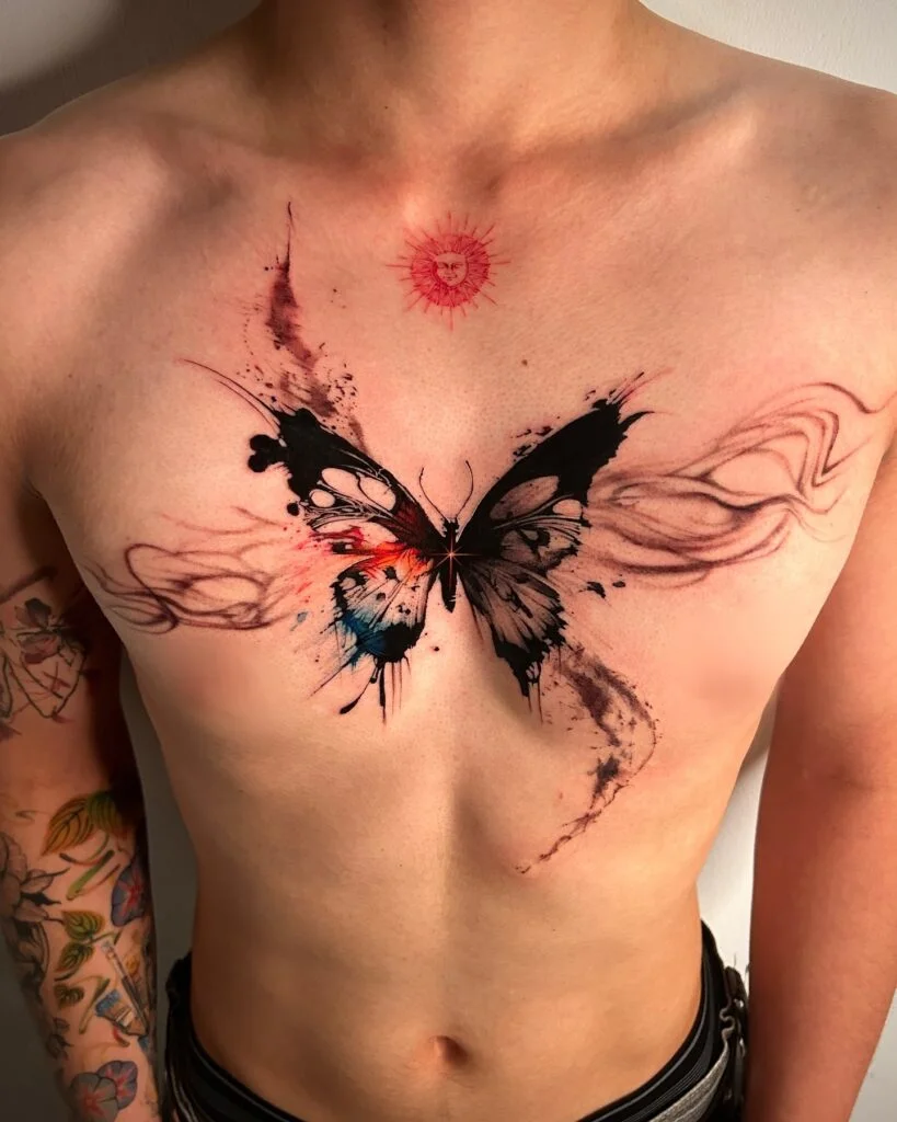 This striking chest tattoo features a large black butterfly with a dramatic watercolor splash effect. Red, blue, and smoky tones blend around the wings, creating a chaotic yet mesmerizing visual. The butterfly is centered on the chest with abstract, flowing lines extending outward, resembling wind or spirit.