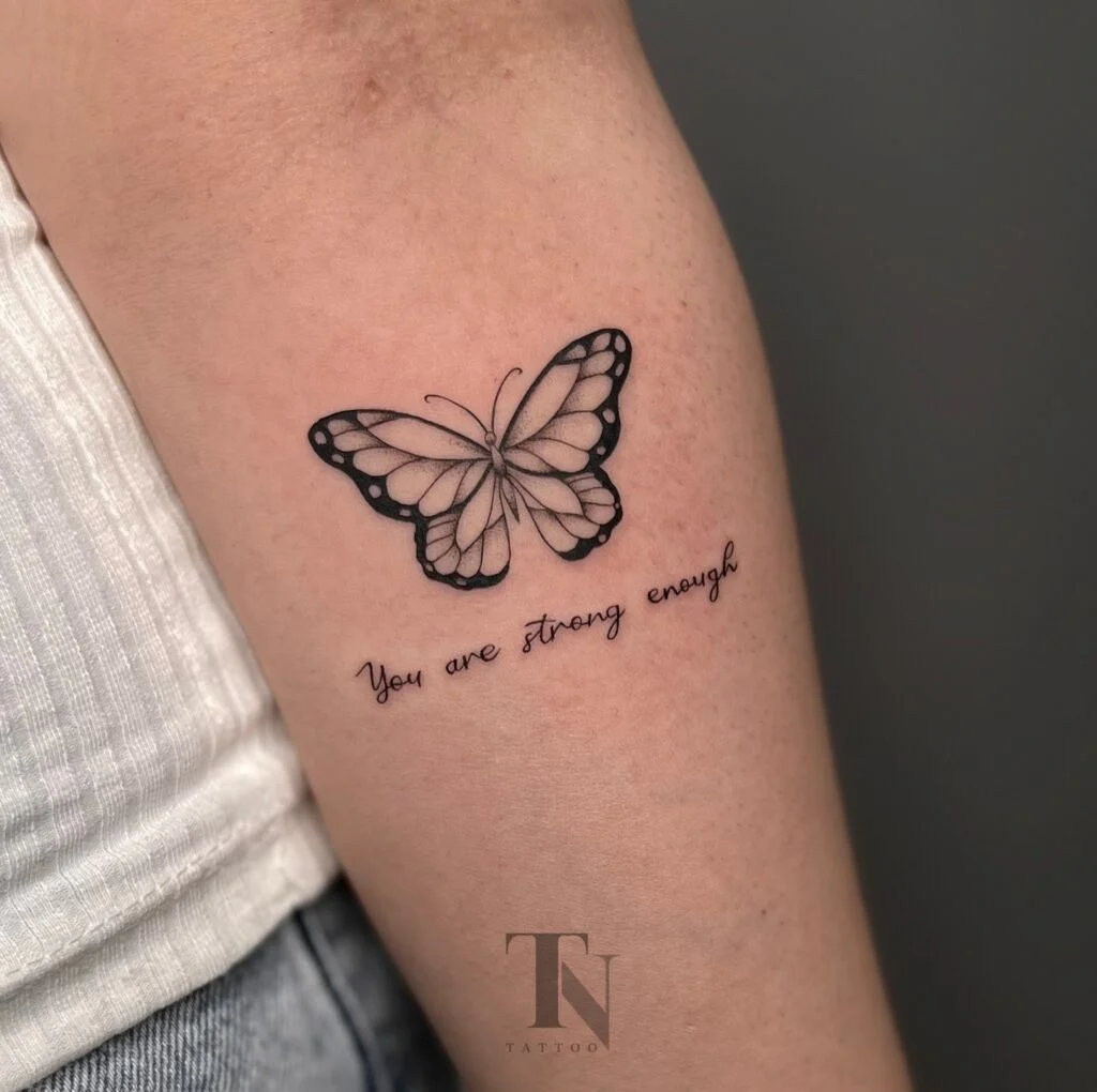 This delicate black and grey butterfly tattoo is paired with the empowering phrase, “You are strong enough,” in elegant cursive script. The butterfly features soft shading and simple, graceful wings with white dot accents along the edges, emphasizing beauty in resilience.