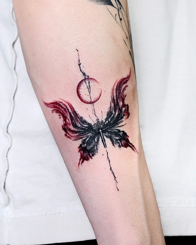 This bold butterfly tattoo combines abstract artistry with symbolic elements. The wings appear fiery and distressed, fading from black into vivid red, creating a powerful visual impact. A vertical, cracked line slices through the center, connecting a red crescent-shaped moon above and extending below the butterfly, suggesting themes of duality, transformation, and inner fracture.
