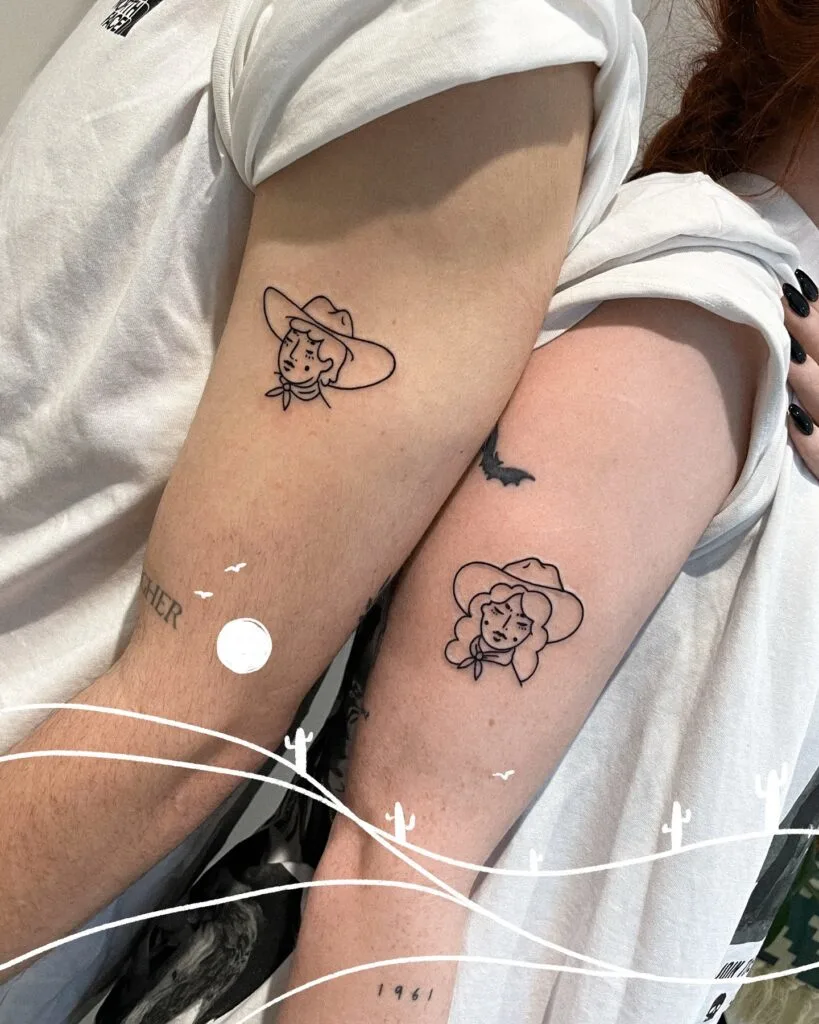The style is simple yet bold, giving off a fun, Western-inspired vibe. Perfect for a couple who loves adventure or shares a love for cowboy culture, this tattoo duo celebrates partnership with a quirky twist and a touch of wild frontier spirit.