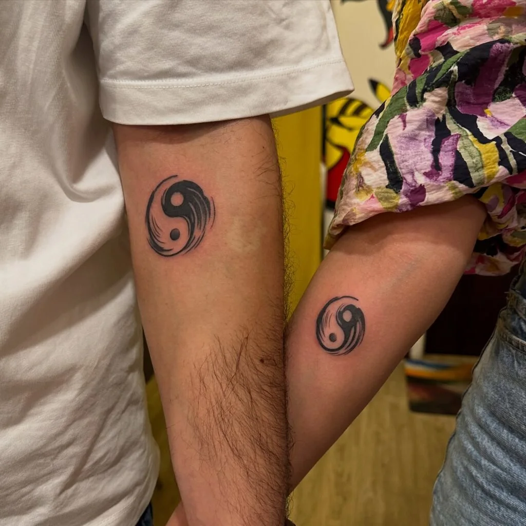 These matching tattoos feature a stylized Yin and Yang symbol, expressing perfect balance and unity between two people. With swirling black and white elements, the design reflects the idea that opposites not only attract but also complete each other.