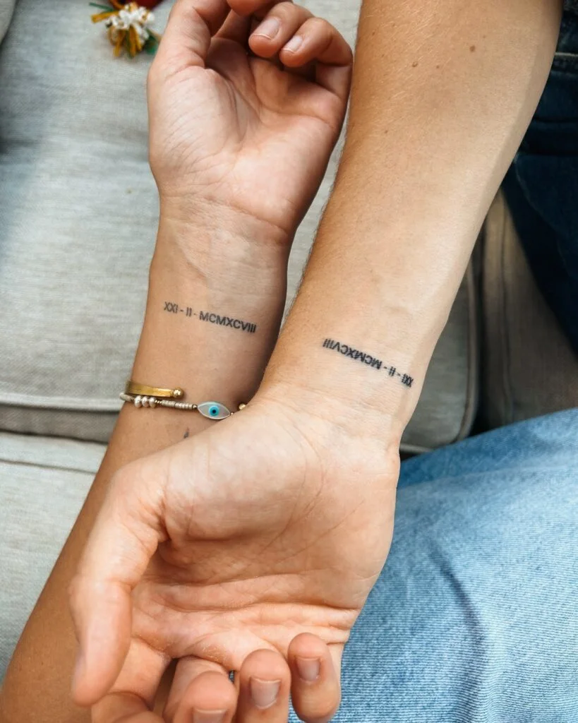 This couple’s tattoo features matching Roman numerals inked on the inner wrists, likely representing meaningful dates such as birthdays or anniversaries. The minimal, clean typography adds a timeless elegance, while the mirrored placement reinforces their connection.