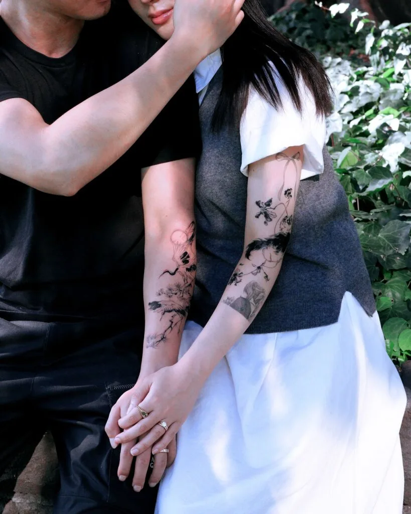 These stunning couple tattoos feature complementary black and gray designs in a delicate brushstroke style. One arm displays elegant cranes in flight among wispy flowers, while the other features graceful floral elements and soft, romantic portraiture. The cranes symbolize longevity and loyalty, while the floral accents reflect beauty and growth.