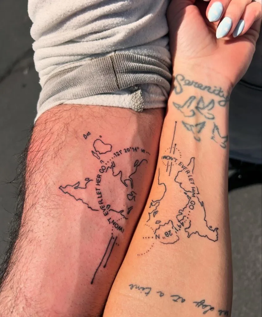 These unique couple tattoos feature matching map outlines with precise coordinates and the heartfelt phrase “I won’t ever let her/him go.” The designs suggest a shared location with deep personal meaning—perhaps where they met, fell in love, or made a life-changing memory.