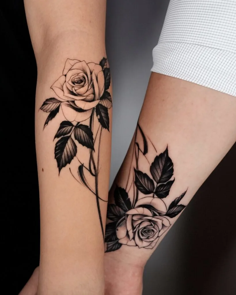 These beautifully detailed rose tattoos are placed on each partner’s forearm, designed to face each other when held together. The realistic shading, sharp contrast, and delicate linework bring each rose to life, symbolizing love, growth, and enduring passion.