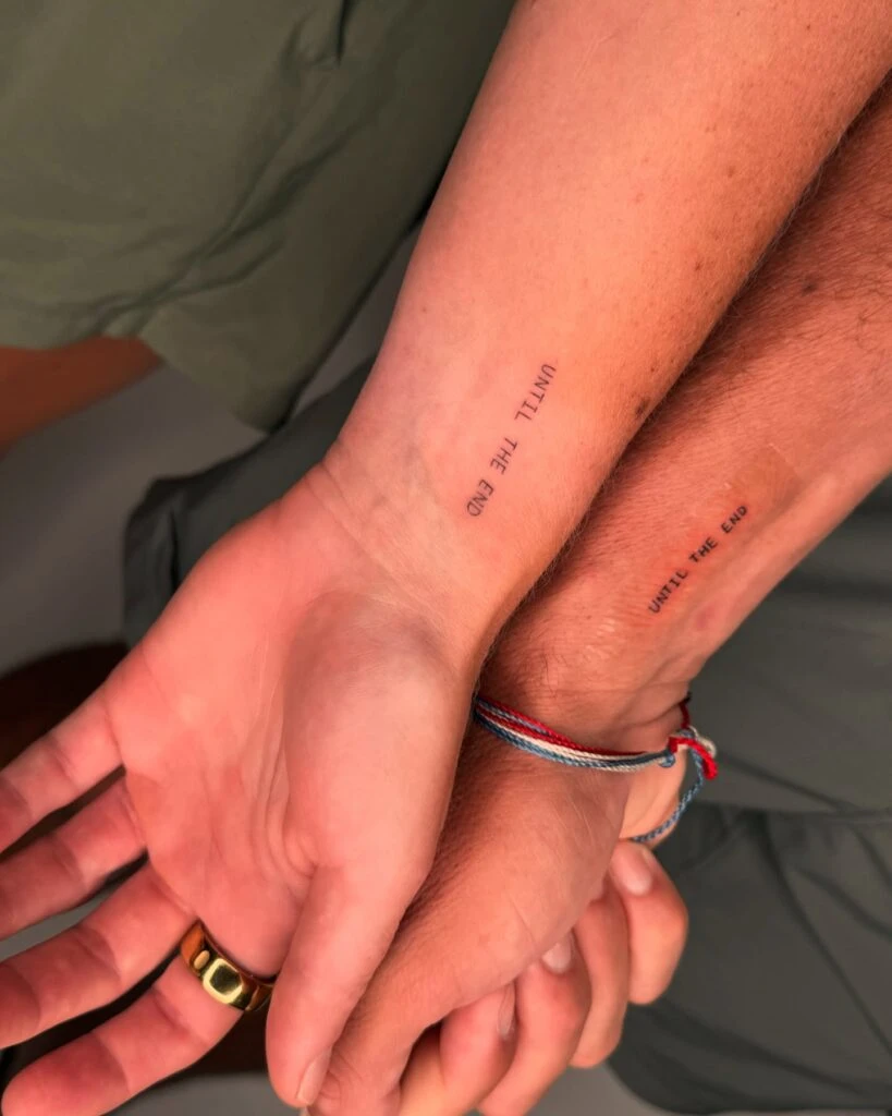 These minimalist wrist tattoos feature the phrase “UNTIL THE END” in clean, uppercase lettering on both partners’ forearms. The simplicity of the design enhances its emotional weight, expressing unwavering commitment and lasting devotion.