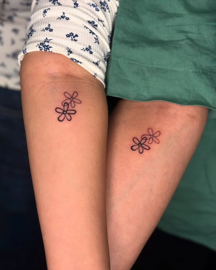These minimalist matching tattoos feature a tiny five-petal flower placed delicately on each wrist. The simple black outline creates a soft and charming design, symbolizing shared joy, growth, and the beauty of connection.