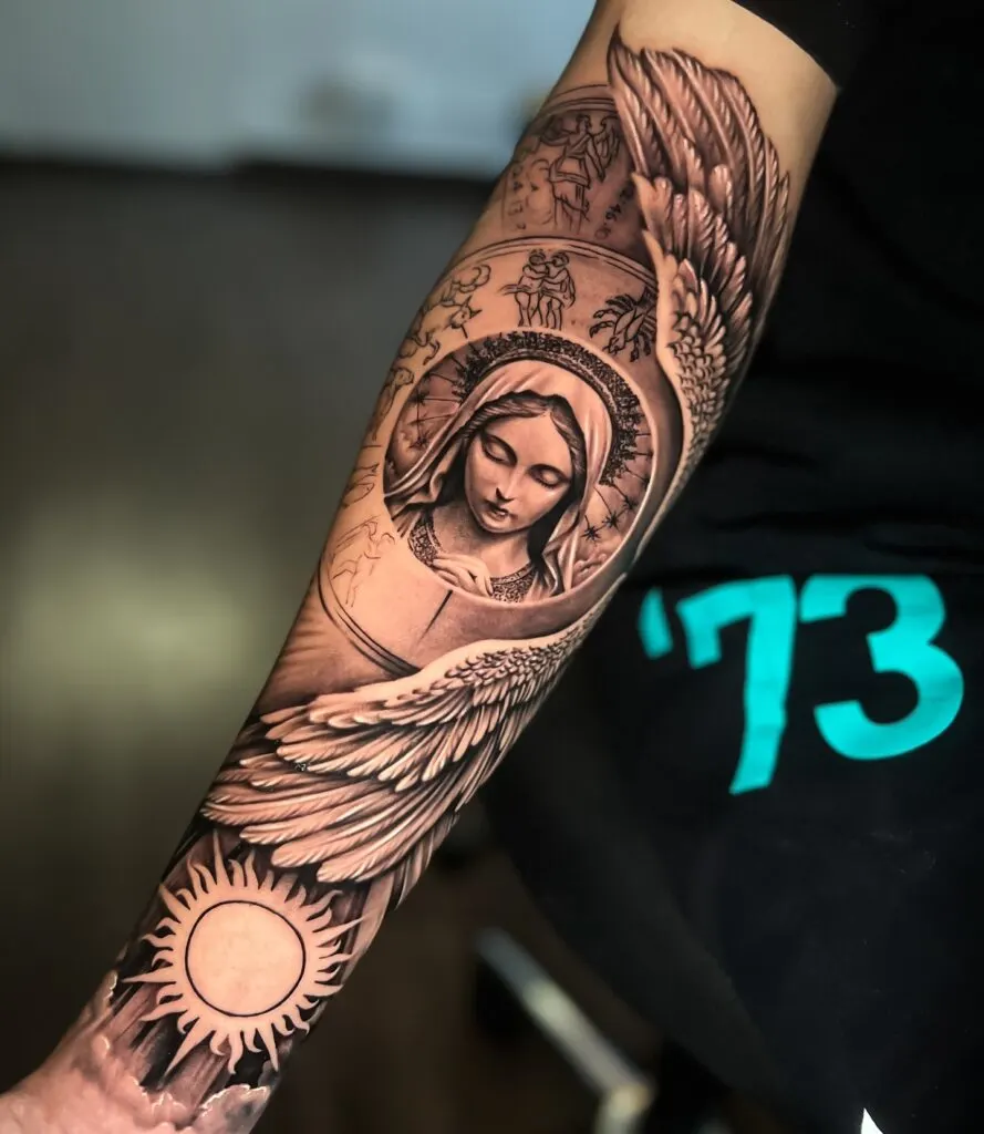 This breathtaking forearm tattoo features a serene portrait of the Virgin Mary, framed with intricate stars and a sacred halo. The design is enriched with angel wings that sweep dramatically around her, offering a sense of divine protection and spiritual grace.