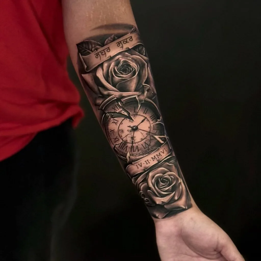 This emotional forearm tattoo features a cracked vintage clock with Roman numerals, surrounded by beautifully shaded roses and a date in Roman numerals (IV·II·MMVI). A banner with text written in Gurmukhi script adds a personal cultural touch.