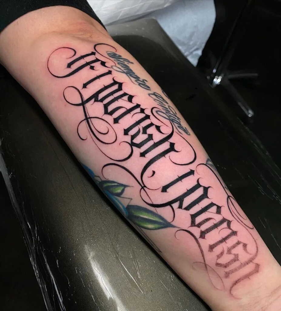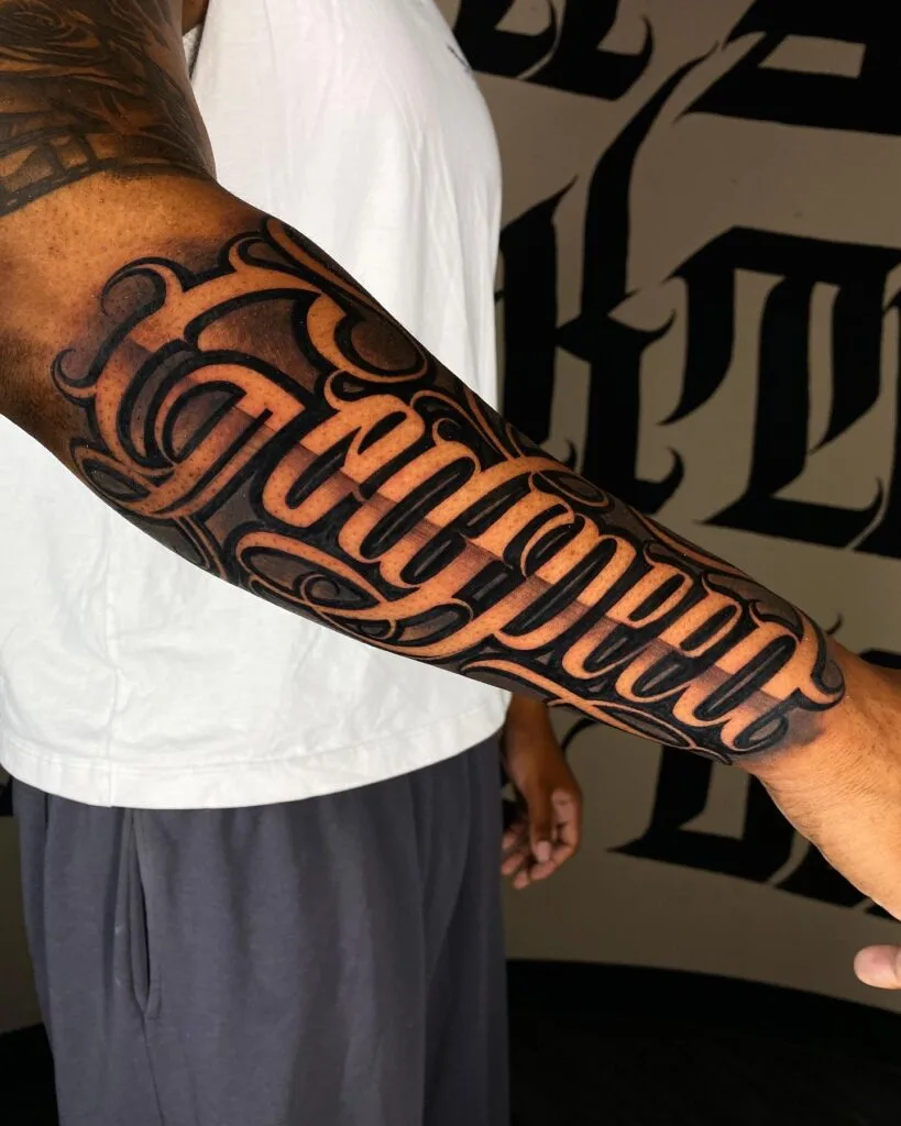 Ambigram-Style Script Forearm Tattoo