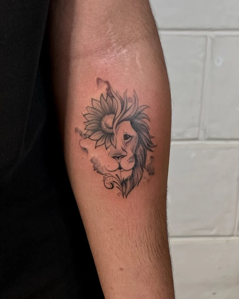 This unique forearm tattoo features a creative blend of a lion’s face with a sunflower, split symmetrically down the center. One side displays the lion’s regal expression with flowing mane details, while the other transforms into a blooming sunflower, symbolizing positivity and growth.
