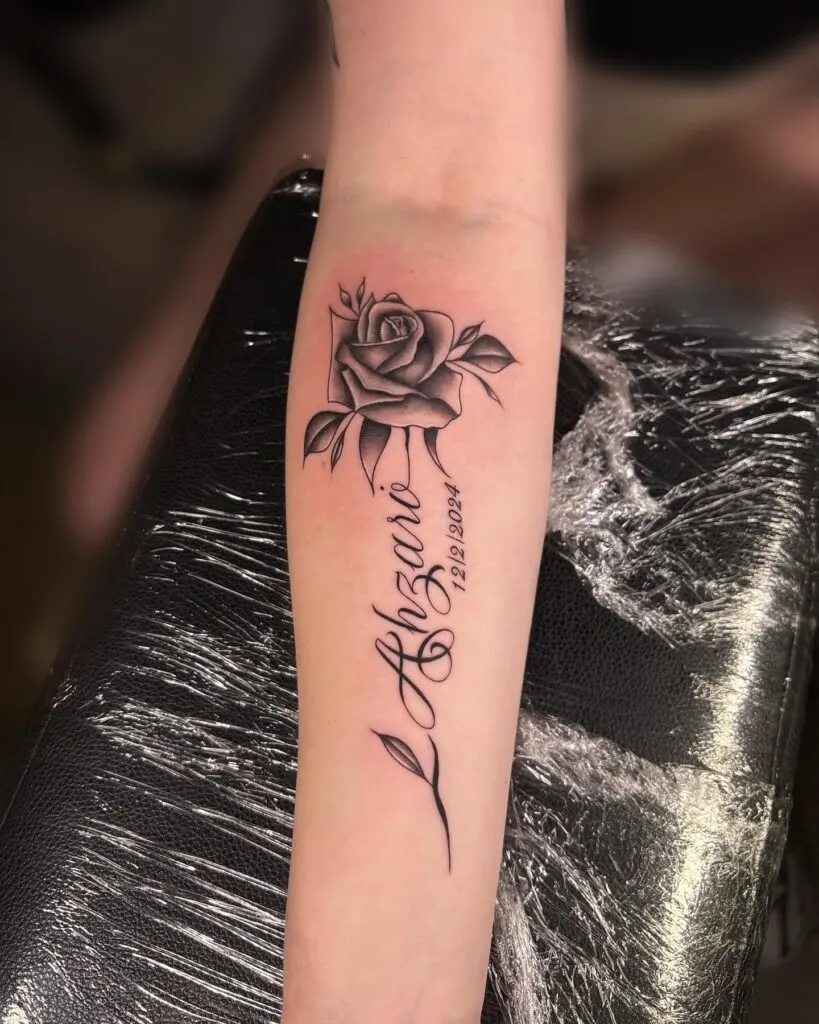 This touching forearm tattoo combines a beautifully shaded black and gray rose with delicate script lettering. The name “Ahzari” is written in elegant cursive, flowing beneath the rose, followed by a significant date—12.12.2024—likely marking a birth or cherished moment.