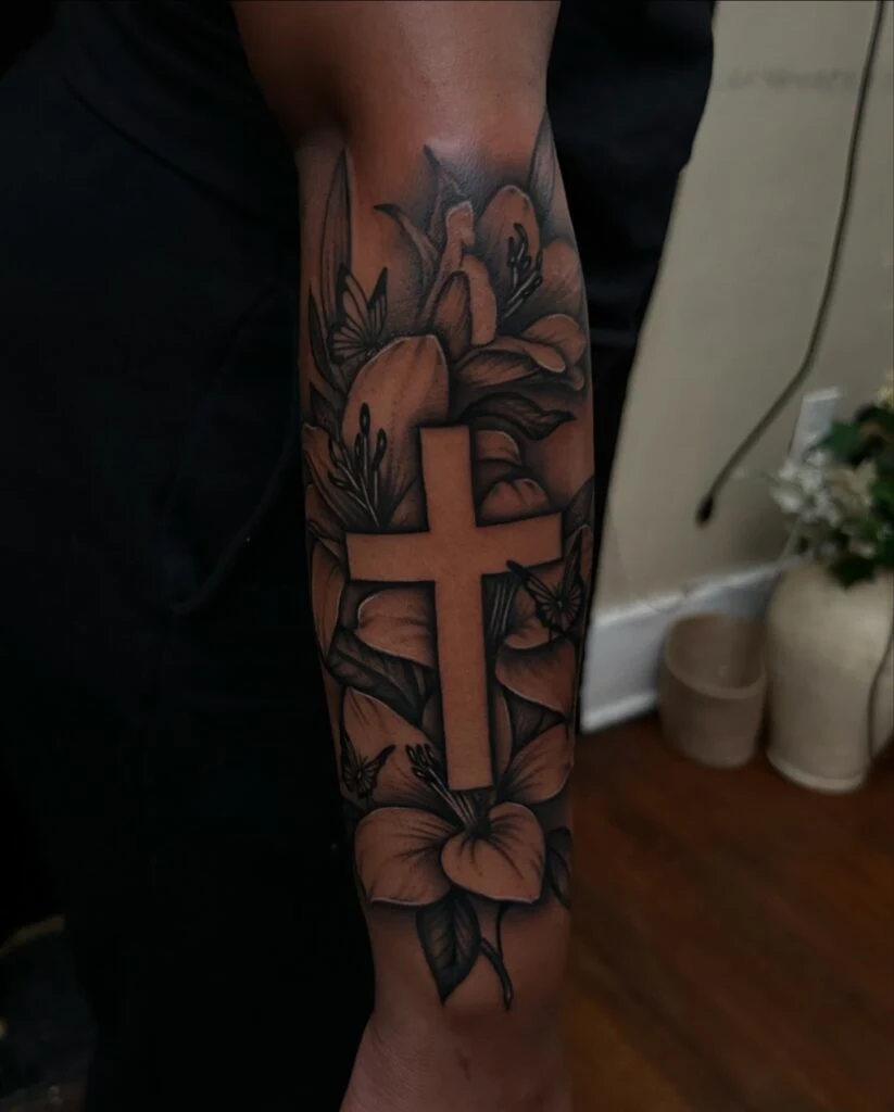 This forearm tattoo features a bold cross at the center, surrounded by beautifully shaded lilies and subtle butterflies. The cross itself is left unshaded, standing out starkly against the dark floral background. Lilies, often symbols of purity and renewal, complement the religious significance of the cross, while the butterflies add a gentle sense of transformation and hope.
