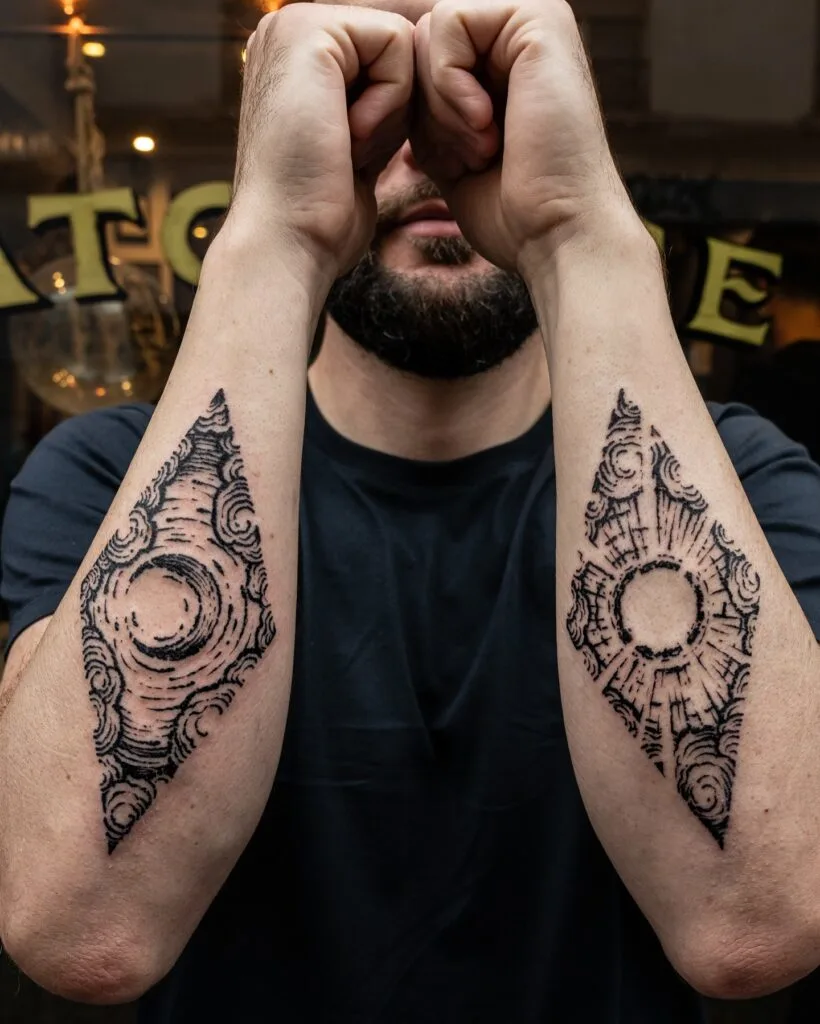 This forearm tattoo pair features a bold and creative sun and moon design split between both arms. On one arm, swirling cloud-like patterns form a circular motif that evokes the moon. On the other, angular rays radiate from a similar circle, suggesting the sun’s energy.