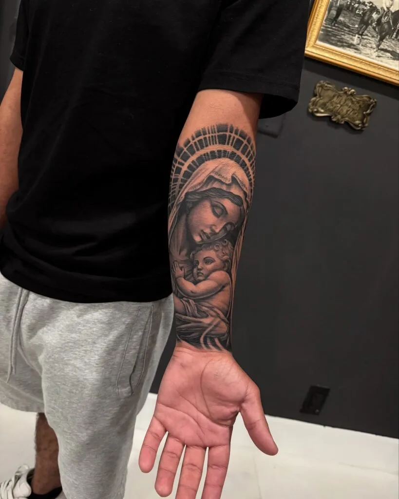 This deeply moving forearm tattoo features a stunning black and gray depiction of the Virgin Mary cradling Baby Jesus. The artwork is highly detailed, capturing their peaceful expressions and soft drapery with delicate shading. A radiant halo arches over Mary’s head, symbolizing divine grace and protection.
