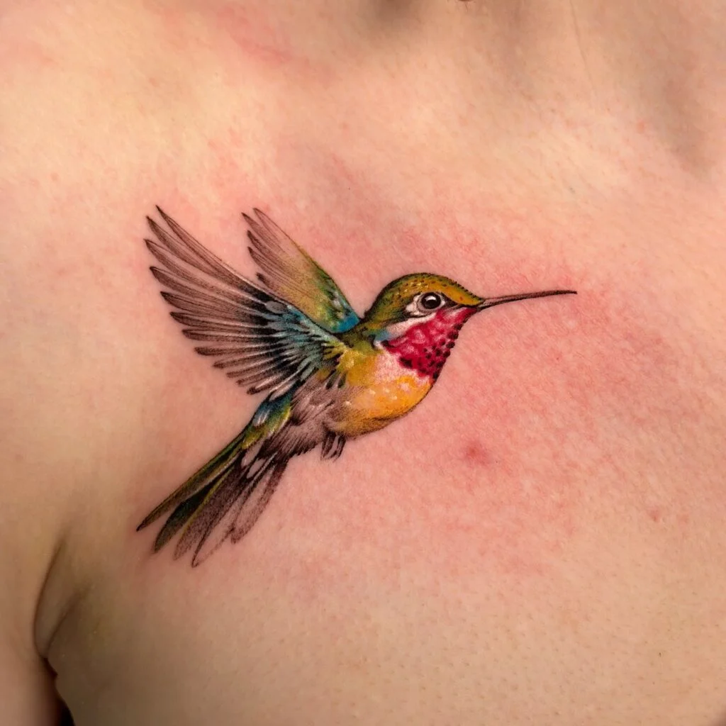 This lifelike tattoo features a ruby-throated hummingbird in mid-flight, inked on the chest with meticulous detail and natural hues. Its iridescent green feathers blend seamlessly into golden yellow underbelly tones, while the bright red throat patch stands out against subtle shading.