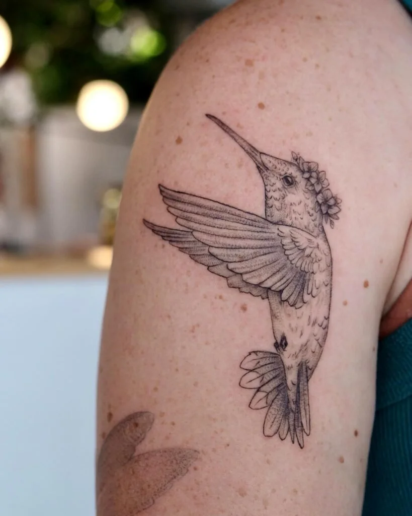 This charming tattoo features a hummingbird drawn in fine black ink, adorned with a delicate crown of flowers atop its head. The detailed linework and soft dot shading bring out the bird’s feathers and texture while keeping the overall design subtle and elegant.