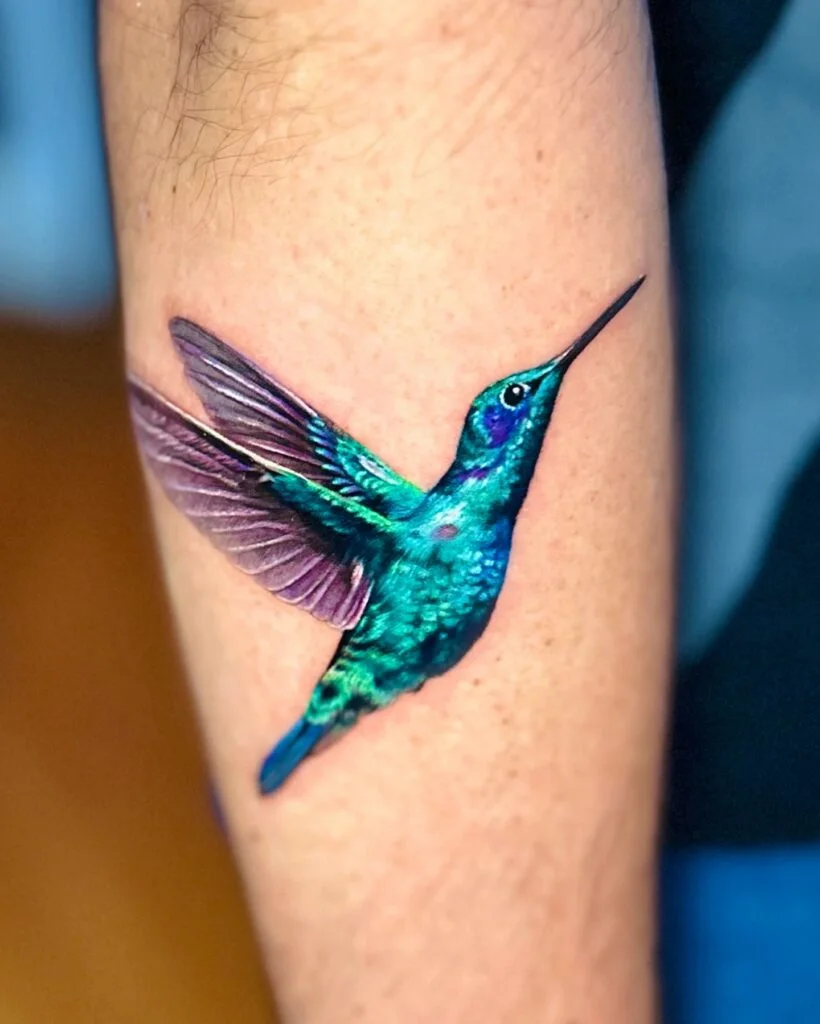 This striking tattoo features a hummingbird in rich shades of electric blue and deep purple, captured in motion with lifelike detail. The bird’s feathers shimmer with dimension, especially around the wings and throat, giving it a bold, almost glowing appearance.